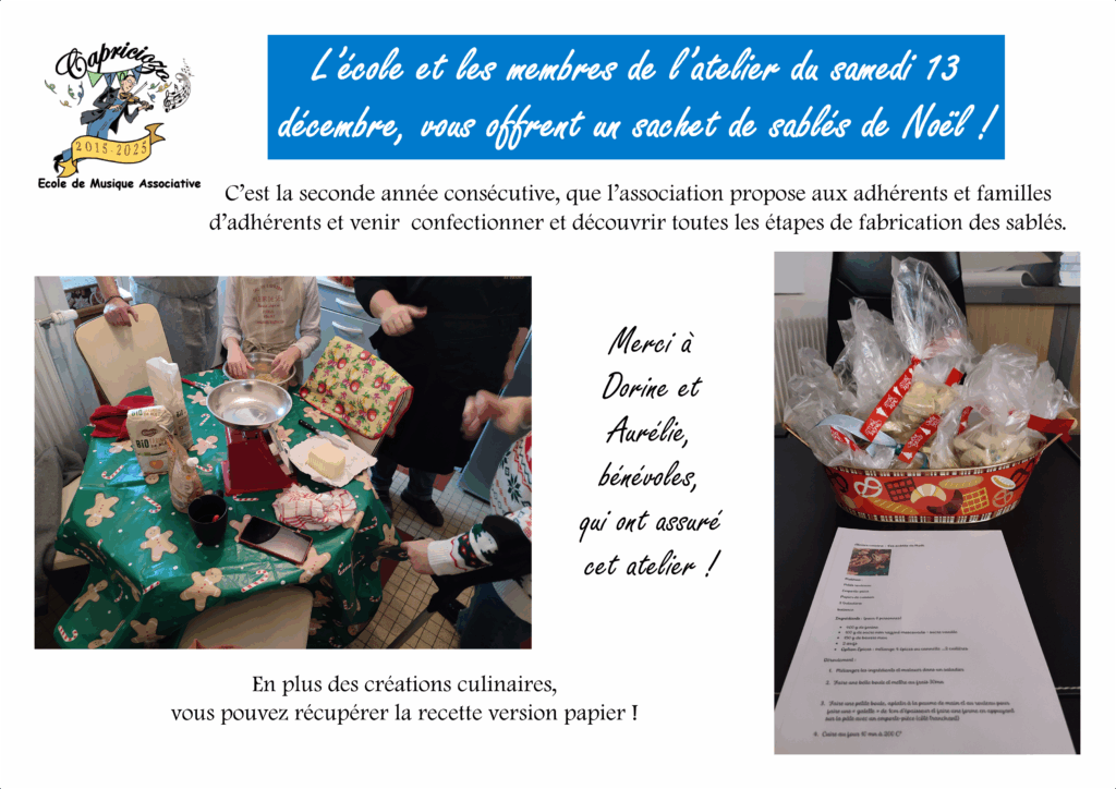 L’atelier et les sablés sont offerts par l’association pour vous accompagner pendant les vacances et fêtes de fin d’année !