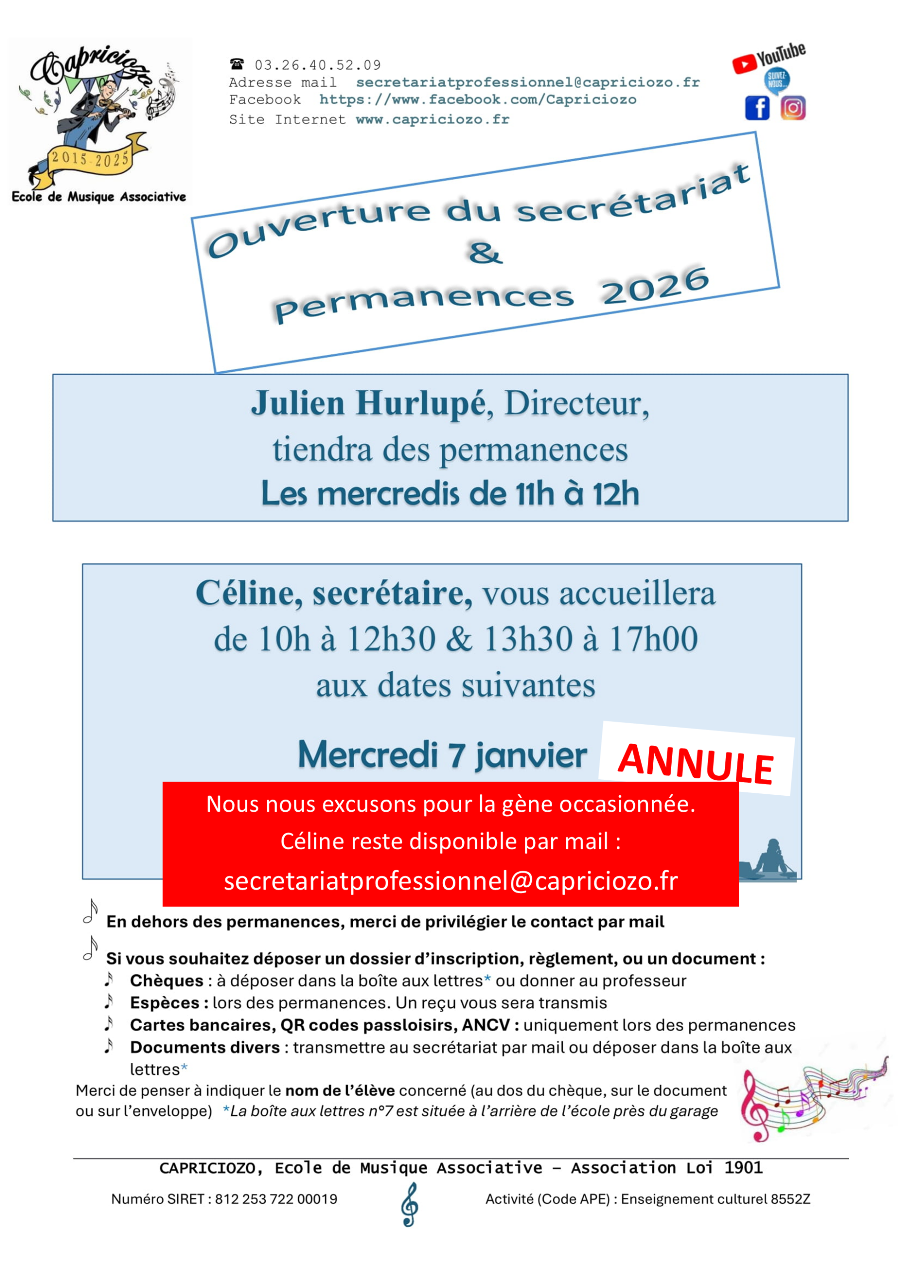 Permanence secrétariat du 07 janvier 2026 ANNULÉE